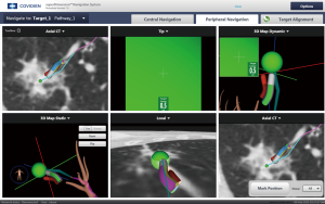 Tissue sampling of peripheral lung nodules is commonly performed bronchoscopically using ENB. This form of bronchoscopy is an image-guided localization procedure utilizing steerable catheters combined with highly specialized navigation software to create three-dimensional anatomical maps. The ENB system is comprised of an electromagnetic board, locatable guide, extended working channel, and a steerable catheter to sample lung nodules in intermediate and high-risk patients. By directing the locatable guide along the created pathway to peripheral lesions, in a manner similar to that of global positioning software (GPS), a bronchoscopist can perform brushings, biopsies, and washings of target nodules (Figure 1). Along with sampling peripheral lung lesions with ENB, physicians with advanced training in EBUS bronchoscopy are able to effectively biopsy lymph nodes in the mediastinum to determine a cancer stage during the same procedure. As a result, the ability to biopsy lung nodules and simultaneously stage the mediastinum makes bronchoscopy the ideal diagnostic modality to sample nodules identified through lung cancer screening.