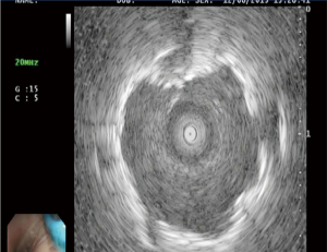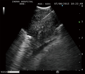 The American College of Chest Physicians (ACCP) recommendation for the mediastinal staging of patients with non-small cell lung cancer endorses EBUS bronchoscopy (14). Through real time ultrasound imaging, EBUS provides clear images of lymph nodes and proximal lung masses that can be adequately sampled through transbronchial needle aspiration (TBNA) (Figure 3). EBUS is a minimally invasive, outpatient procedure. Large studies investigating the use of EBUS for mediastinal staging have shown the procedure to be highly sensitive (93%) and specific (100%) while harboring an excellent safety profile (15). Pulmonologists with extensive training in performing EBUS bronchoscopy are capable of accurately staging the mediastinum by sampling lymph nodes as small as 5 mm. When peripheral lung nodules are sampled using ENB, the use of EBUS to stage the mediastinum is virtually always performed during the same procedure. As a result, unlike TTNA which does not offer access to mediastinal lymph nodes, advanced bronchoscopy utilizing EMN and EBUS to diagnose and stage lung cancer is the ideal to biopsy lung nodules identified through lung cancer screening.