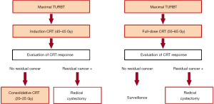 TMT comprising maximal TURBT followed by CRT is the current mainstream of the CRT-based bladder preservation approach. The current TMT protocols included two types of therapeutic courses: split or continuous course (Figure 1). A common practice between the two types of protocols is to offer prompt salvage RC for patients whose tumors do not respond to CRT. CRT response is generally assessed on cystoscopy, urine cytology, radiological examination, and/or transurethral biopsy of the bladder mucosa.