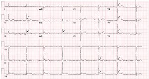 The “J wave or Osborn wave” was first described by Dr. John Osborn in 1953 as a “current of injury” which resulted from experimentally induced hypothermia. Osborn waves are the positive deflections of the ST-T wave junction and are best seen in the inferior leads and lateral precordial leads. Their size becomes more pronounced as the body temperature drops, and they gradually disappear with rewarming. The Osborn waves can predispose to ventricular arrhythmias, thus, the presence of this should keep the treating physician more alert while providing patient care. Osborn waves can also be seen in other clinical conditions such as idiopathic ventricular fibrillation, hypercalcemia, brain injury, Brugada syndrome, and vasospastic angina.
