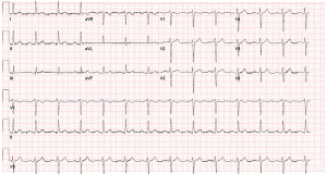 A 70-year-old man was brought to the emergency department by the Emergency Medical Services (EMS) in altered mental status. The patient had medical history significant for prediabetes, benign prostatic hyperplasia, and quadriparesis from remote history of motor vehicle accident. The patient was becoming more confused for which EMS was called by the family. When EMS arrived, the patient was found sitting in front of an open window without any clothes on and the weather was cold because it was wintertime. On arrival, he was disoriented, with a body temperature of 86.1 ℉, heart rate at 52 beats/minute, blood pressure 91/51 mmHg, respiratory rate at 11 breaths/minute, hemoglobin 11.7 g/dL, and platelets of 97,000/mm3. Serum electrolytes, troponin, and computed tomography (CT) of the head were within normal limits. Urine toxicology was negative. The 12-lead electrocardiogram (ECG) on admission revealed marked sinus bradycardia (45 beats/minute) with a first-degree atrioventricular block (PR interval =0.29 seconds) and an elevation of J point, also known as “Osborn waves”, which were more prominent in the inferior (II, III, aVF) and the lateral precordial leads (V4 through V6) as seen in Figure 1. The diagnosis of moderate hypothermia was made, and active external and internal rewarming was started. Following rewarming, ECG revealed the disappearance of Osborn waves (Figure 2).