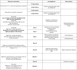 COVID-19, coronavirus disease 2019; VA, visual acuity; AION, anterior ischemic optic neuropathy; NA, not available; DM, diabetes mellitus; HTN, hypertension; CAD, coronary artery disease; RE, right eye; LE, left eye; LP, light perception; AAGC, acute angle closure glaucoma; PION, posterior ischemic optic neuropathy; CF, count fingers; HHcy, hyperhomocysteinemia.